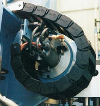 左側的照片顯示了利用“標準”拖鏈實現的旋轉運動(這里,“標準”表示拖鏈只能在一個方向上彎曲)。如果能夠提供足夠的空間,而且旋轉角度限制在 450°以內,都可使用這種解決方案。
