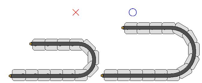 另外,電纜的移動部分如果被固定,會導致彎曲應力無法被分散及吸收,會在固定位置造成應力集中。電纜的固定部位應設置在拖鏈的兩端。