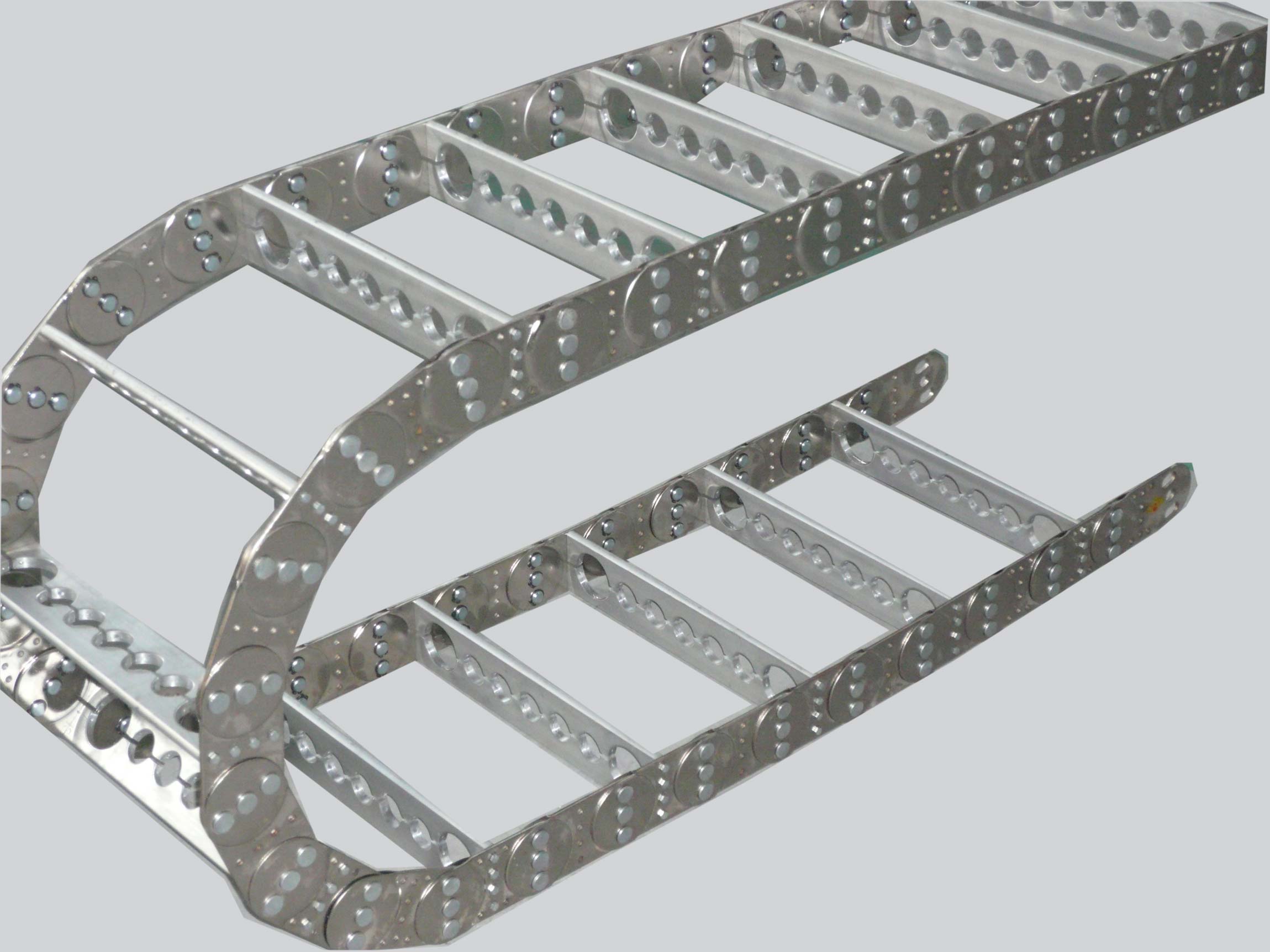 鋼鋁拖鏈適用于所有傳動方式,可隨意加長和縮短,TLG型鋼鋁拖鏈可承載更多數量及重量較大的電纜及油管,自由懸置長度大,支撐板可根據實際需要定制,也可通過改變銷軸來改變彎曲半徑。