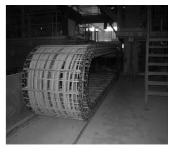 圖3 為某鋼管廠168 鋼管生產(chǎn)穿管機用拖鏈,型號:NTLK125II -380 ×300 ×8875。由于該拖鏈運行速度為6m/s,用傳統(tǒng)工藝制作的拖鏈只能用7 ~ 15 天。用長壽命鋼制拖鏈?zhǔn)褂脡勖岣叩?20 天以上。3. 2 長壽命鋼制拖鏈在煉鋼上應(yīng)用