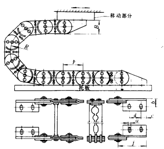 結構特點:鏈條由Y型鏈板通過銷軸連接而成。使用時,兩排鏈通過連接件連接使用。并把自動化設備操作所需的電纜、電線、液壓軟管、壓縮空氣軟管、冷卻水管、切削液管等敷設在支撐板上可以隨動拖鏈一起作有規則的動作,從而使各軟管不致紊亂、交錯和糾結。鏈條的轉動限位,靠長銷軸旁邊的兩個短銷軸與鏈板的兩個長孔配合來實現。